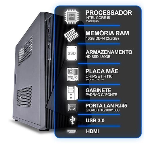 Computador Desktop, Intel Core I5 7º Geração, 16Gb Ram, Hd Ssd 480Gb, Conexões Usb/Vga/Hdmi/Lan/Som