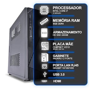 Além disso, este computador desktop possui um HD SSD de 240GB, que oferece um armazenamento rápido e confiável para todos os seus arquivos e programas.