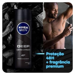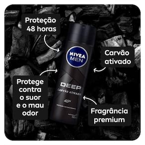 NIVEA MEN DEEP Antitranspirante protege a pele do suor e das bactérias durante 48hrs, proporcionando uma sensação duradoura de pele limpa e seca, exatamente como após o banho. Sua fórmula eficaz com Carvão Ativado atua poderosamente contra bactérias e propociona uma fragrância moderna e masculina.