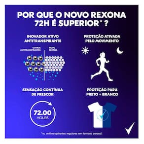 Sobre a marca: Lançada no Brasil em 1969, Rexona, marca da Unilever, é líder do mercado brasileiro de desodorantes. A marca tem consolidado e ampliado sua presença por meio de uma constante inovação em sua linha de produtos, formulações e embalagens. Rexona é, há 16 anos, a primeira marca de desodorantes que vem à cabeça do consumidor brasileiro, de acordo com a pesquisa Top of Mind do Instituto Datafolha. Rexona te dá a confiança necessária para enfrentar os desafios do dia a dia. Com a exclusiva tecnologia de Rexona, que libera proteção adicional conforme a necessidade, você sabe que seu desodorante não vai te deixar na mão. Melhor ainda, hoje a marca oferece produtos que atendem às necessidades específicas dos consumidores através das linhas Rexona Women, Rexona Men e Rexona Teens.