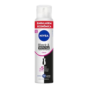NIVEA Desodorante Aerossol Black & White INVISIBLE Clear proporciona a melhor proteção contra manchas e suor. Sua fórmula é 5x anti odor, suor, manchas, resíduos nas roupas e irritação na pele, com proteção prolongada de 72 horas. Evita manchas brancas em roupas pretas e manchas amarelas em roupas brancas.