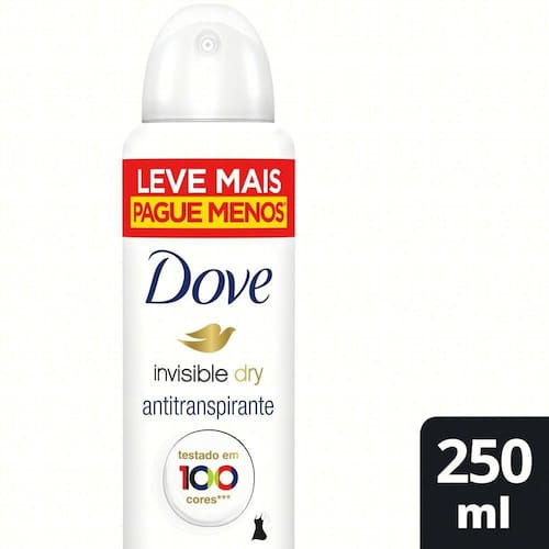 O Desodorante Antitranspirante Aerosol Dove Invisible Dry não deixa manchas brancas nas roupas, testado em 100 cores de tecidos. Com tecnologia superior, o antitranspirante Dove protege contra o suor e mau odor por até 48h, deixando uma sensação de frescor e sem manchas. Contém o exclusivo 1/4 de creme hidratante Dove enriquecido com óleo protetor, para axilas ainda mais macias e suaves. Garante proteção antitranspirante eficaz e o melhor cuidado para a pele das axilas. Dove Invisible Dry é um desodorante antitranspirante sem álcool e dermatologicamente testado. Dove não realiza testes em animais, sendo certificada como Cruelty-Free pela PETA, o aerosol não danifica a camada de ozônio e nossas latas são feitas de metal reciclável.