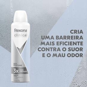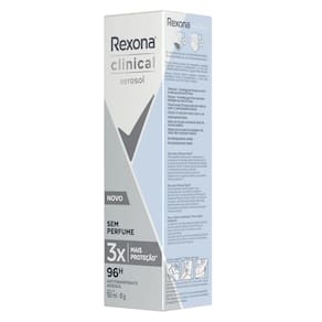 O Desodorante Aerosol Rexona Clinical Sem Perfume proporciona proteção máxima para as axilas, sua fórmula eficaz oferece 3X mais proteção que um antitranspirante comum. O Rexona Clinical Sem Perfume possui a inovadora fórmula termo-ativa e conta com a exclusiva tecnologia Defense+, que se adapta ao organismo, ajudando a prevenir a transpiração e o mau odor, além de proporcionar até 96 horas de proteção, mantendo você mais fresca e segura. Dermatologicamente testado.