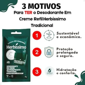 Desodorante Em Creme Refil Herbíssimo Tradicional Antiperspirante 45g Garanta proteção eficaz e duradoura contra o suor e o mau odor com o Desodorante Em Creme Refil Herbíssimo Tradicional Antiperspirante 45g. Desenvolvido pela tradicional marca HERBISSIMO, este refil é a escolha inteligente para quem busca economia sem abrir mão da qualidade e do cuidado com o meio ambiente. Sinta a confiança de estar protegido o dia todo, com uma fórmula suave que hidrata a pele e evita irritações. Ideal para homens e mulheres que prezam por praticidade e bem-estar, este refil é perfeito para manter a sua rotina de higiene pessoal em dia, com a vantagem de um produto sustentável e econômico.