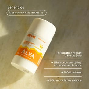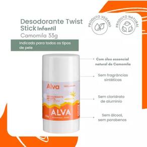 Desodorante Infantil Alva Kids Twist Stick Camomila O primeiro desodorante 100% natural desenvolvido exclusivamente para crianças. Elimina as bactérias que causam o odor e ajuda a hidratar e regular o