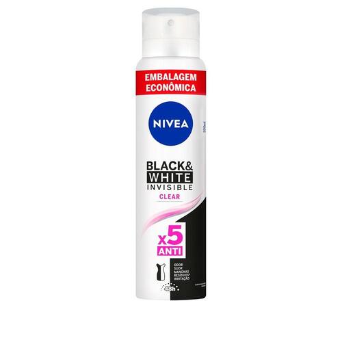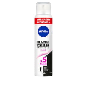 NIVEA Desodorante Antitranspirante Aerossol Invisible Black & White Clear 200ml O que é? Desodorante feminino antitranspirante que garante proteção eficaz por 48h e evita manchas nas roupas. Você livre de manchas, suor e mau odor. Confira! Para que serve o Desodorante Aerosol Nivea Invisible Black & White Clear? Poderosa fórmula elimina 99,9% das bactérias da pele e evita manchas brancas em roupas pretas e manchas amarelas em roupas brancas. Benefícios e diferenciais - A melhor proteção contra manchas e suor - 2x mais agentes antitranspirantes e minerais - Sem álcool etílico e corantes Como usar o Desodorante Aerosol Nivea Invisible Black & White Clear? Agite bem antes de usar. Ao aplicar o produto, mantenha o frasco a aprox. 15 cm da axila. Espere secar antes de se vestir. Uma unidade de embalagem contém 200ml Ingredientes: Não inclui Álcool (Álcool Etílico) Butane, Isobutane, Propane, Cyclomethicone, Aluminum Chlorohydrate, C12-15 Alkyl Benzoate, Isopropyl Palmitate, Disteardimonium Hectorite, Octyldodecanol, Propylene Carbonate, Dimethiconol, Palmitamidopropyltrimonium Chloride, Propylene Glycol, Linalool, Citronellol, Butylphenyl Methylpropional, Limonene, Alpha-Isomethyl Ionone, Benzyl Alcohol, Geraniol, Parfum