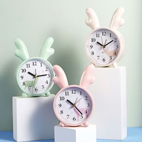 Material: plástico Tamanho: 165* 40* 110 mm Peso: 140 g Cor enviada aleatoriamente Design divertido de chifre de rena — Este encantador despertador apresenta lindos chifres de rena, tornando-o uma adição deliciosa e extravagante ao quarto ou mesa de qualquer criança. Silencioso e sem tique-taque — Desfrute de uma noite de sono tranquila com este relógio de movimento silencioso, ideal para quem prefere um ambiente tranquilo e repousante sem sons de tique-taque. Display analógico de fácil leitura — Com números pretos nítidos em um fundo branco e ponteiros ousados, este relógio oferece um design simples e clássico que é fácil para as crianças lerem. Perfeito para crianças e estudantes — O design divertido e a fácil funcionalidade o tornam a escolha ideal para crianças e estudantes, ajudando-os a acordar na hora certa e adicionando uma peça de decoração divertida ao quarto. Operado por bateria — Alimentado por baterias, este relógio portátil pode ser colocado em qualquer lugar, tornando-o conveniente para uso em mesinhas de cabeceira, mesas ou como relógio de viagem.