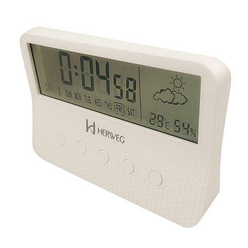 Despertador Digital Importado Branco Herweg 2986 único Despertador Digital Importado Branco Herweg 2986 único - Características Gerais do Produto: - Acabamento / funcionalidades: Preto - Alimentação: Usa pilha palito AAA ( não inclusa) - Características técnicas: Alarme sonoro; Visualização em 12h ou 24h; Função Termômetro (C / F); Calendário; Higrômetro; Miniestação meteorológico; Timer - Material: Plástico injetado; Visor de Acrílico - Medidas: A: 8,5 x L: 13,0 x P: 3,0cm - Observações: Botões de regulagem na parte frontal - Modelo referência do produto: 2986-021 Acompanha o produto: - 01 Relógio - Eletrônica - Garantia de 12 meses do Fabricante - Embalagem - Manual de Instruções Garantia: - 12 Meses de Garantia de Fábrica