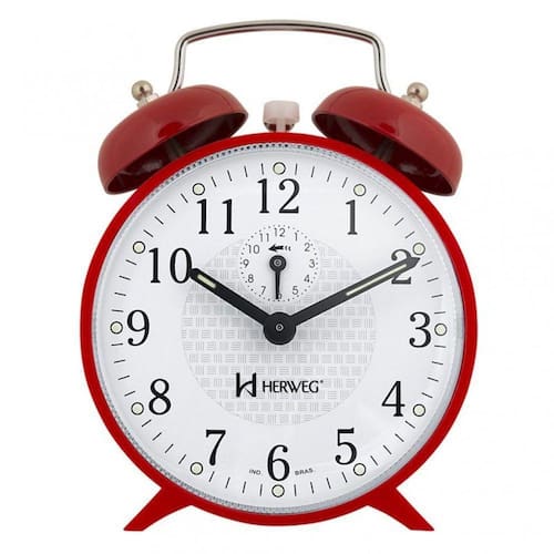 Relógio despertador mecânico à corda herweg 2206-44 Estilo: decorativoBase em plástico pintadoCor: vermelhoMostrador de acrílicoPonteiro com massa luminosaMostrador com massa luminosaBotões de regulagem na parte traseira do produto Dimensões:14 cm altura10,5 cm largura5 cm espessura Manual de instruçõesCertificado de garantia: 12 meses