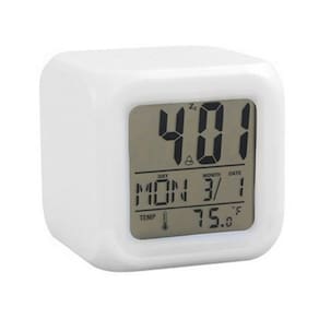 Características destacadas Com um design charmoso e elegante, combina linhas fluidas leves e simples. Completo, elegante e moderno. Cada minuto do ciclo pisca luzes muito coloridas. Esta função é controlada por um interruptor. Tocar na parte superior do produto emite automaticamente luz fria e a luz desaparece após 5 segundos. com termômetro, calendário, calendário, hora do alarme e exibição de configurações. Veja menos