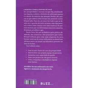 SINOPSE A riqueza começa dentro de você Ter prosperidade e sucesso no que faz, resultando em riqueza, conforto e dinheiro de sobra para gastar, é o desejo da maioria das pessoas. Porém, são poucas as que sabem como tornar isso possível. Carlos Wizard sabe. Para ele, ser rico e ter tudo o que se deseja não é questão de sorte ou acaso, mas algo possível a todos. Tudo começa com uma mudança de postura mental, que vai determinar uma nova maneira de pensar, acreditar e agir. Neste livro, há um verdadeiro guia prático do método, dos conceitos e dos princípios que Carlos Wizard utilizou para criar suas empresas do zero, formar centenas de novos milionários no Brasil nos últimos anos e se tornar um bilionário presente na lista da Forbes.