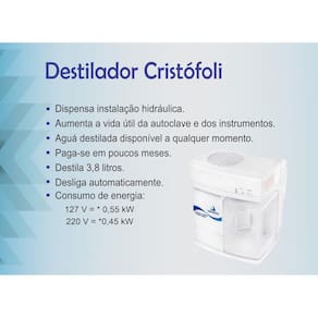 Equipamento desenvolvido para atendê-lo na função da destilação de água para uso em autoclaves de esterilização à vapor ou qualquer outra aplicação onde seja necessária a utilização de água destilada.Fácil manuseio;Design moderno;Baixo consumo de energia, proporciona economia de até 35% nos gastos com água destilada;Tempo para destilar 150 ml de água: 19 minutos;Tempo para destilar 300 ml de água: 37 minutos; Não necessita instalação hidráulica;Obs.: A utilização de água destilada em autoclave aumenta a sua vida útil.Para mais informações, consulte o Manual de Instruções.Este equipamento é fabricado pela Cristófoli Biossegurança, empresa brasileira fabricante e importadora de produtos para a saúde com a certificação ISO 13485 - Produtos para a saúde - Sistemas de Gestão da Qualidade - Requisitos para fins Regulamentares e atendimento aos Requisitos da RDC 16/2013-BPF ANVISA.Cor BrancaCapacidade 4 litrosPotência 127V - 550 Watts / 220V - 450 WattsVoltagem 127 ou 220VFrequência 50/60 HzDimensões 27 x 33 x 27,6 cm (L x A x P)Peso Bruto 4 Kg