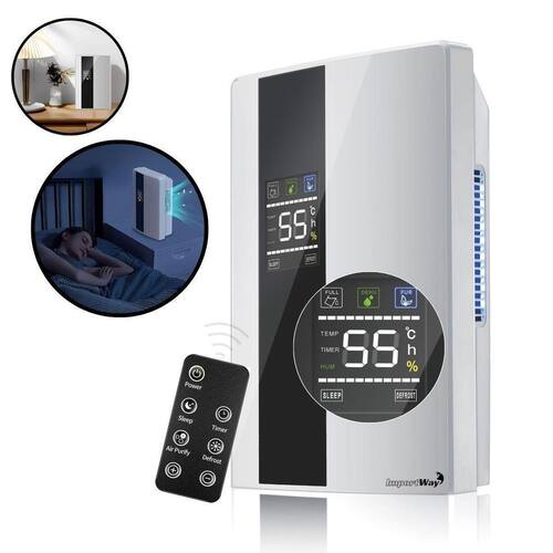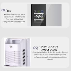 Conta com visor LCD, controle remoto, temporizador de 24h e função de purificação do ar com luz UV e TiO2. Além disso, possui sistema de drenagem manual ou contínua, garantindo praticidade na manutenção.