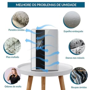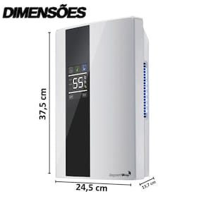 Principais Características Reservatório de 2 litros com aviso em LED vermelho quando cheio Bivolt 100-240V com baixo consumo de energia 60W Sistema termoelétrico Peltier, silencioso e sem compressor Remove até 450ml de umidade por dia 25C, 85% UR Configuração da umidade desejada com desligamento automático Controle remoto incluso para maior conveniência Purificador de ar integrado com luz UV e TiO2 Duas formas de drenagem: reservatório removível ou mangueira de drenagem contínua
