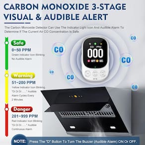 - ?Monitoramento de CO em 3 estágios e alarme audível?O alarme de monóxido de carbono plug-in apresenta indicação de ícone de 3 estágios de acordo com a concentração de CO no ar. 0 ~ 50 PPM (verde = seguro), 51 ~ 200 PPM (amarelo = aviso), 201 ~ 999PPM (vermelho = perigoso). O alarme CO padrão soa um alarme sonoro a 85 dB quando a concentração de CO atinge 51 PPM. Pressione o botão "D" para ligar ou desligar a campainha (alarme sonoro).