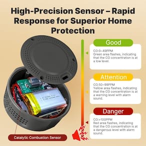 - ?Detectores de CO em tempo real com mais precisão?Tempo de atualização de 2s detectando monóxido de carbono/temperatura/umidade. [Faixa de CO: 0-1000ppm; Faixa de alarme sonoro CO: padrão, 50 ppm. Faixa de configuração personalizável do alarme]; [Temperatura: -10? 50°C (± 1,5 C) / 14 F 122 F (± -16.3 °C)]; [Faixa de umidade: 0% 95% UR (± 5%)]. Leia atentamente o manual antes de planejar para alterar o valor do alerta de CO.