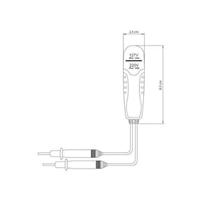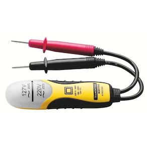 Corpo e plugues injetados em ABS. Corpo revestido com borracha. Lâmpada de neon. Níveis de indicação de voltagem: 127 V e 220 V. Frequência: 50/60 Hz. Condições ambientais: Uso interno, altitude até 2000 m, temperatura de trabalho -5° C até 40° C, umidade relativa de 80% até temperaturas de 31° C e 50% para temperaturas acima de 31° C. Dupla isolação. Design compacto. Utilizado para detecção de voltagem em corrente continua ou corrente alternada. Lâmpadas de neon indicarão a presença de tensão no circuito. Equipamento protegido por dupla isolação. As ferramentas são produzidas e testadas conforme normas específicas.