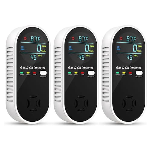 Detector de vazamento de gás natural e detectores de monóxido de carbono - 4 em 1 natural, propano, Co e detector de vazamento de gás - Detectores de monóxido de carbono conectados - Detectores de temperatura e umidade para casa, RV (pacote com 3)