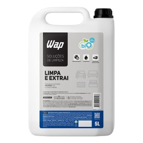 Detergente extratoras estofado tapete 5 l limpa e extrai wap O wap limpa e extrai é um limpador concentrado de baixa espumação, indicado para o uso em extratoras wap para a limpeza de sofás, cadeiras, poltronas, estofados automotivos, colchões, tapetes e carpetes. Sua fórmula com ph neutro, protege você, a superfície, a extratora e o meio ambiente. Por isso, enquanto você cuida da limpeza, também está cuidando da natureza. O detergente para extratoras wap limpa e extrai é altamente eficiente na remoção das sujeiras, renovando e perfumando o ambiente com uma sofisticada fragrância de cereja e avelã. Encontre o limpa e extrai da wap nas versões de 1l e 5l, indicado para limpezas residenciais e profissionais. O uso deste produto somado às potentes extratoras wap desempenha um incrível resultado de limpeza, além de render muito mais, graças à sua fórmula concentrada que deve ser diluída em água. Soluções de limpeza e cuidado com o ambiente: é wap Detergente limpador para extratorasLimpador para uso em extratoras. Indicado para a limpeza de sofás, cadeiras, poltronas, estofados automotivos, colchões, tapetes e carpetes. Formulado com antiespumanteSem espuma - o limpa e extrai oferece facilidade e segurança na hora da limpeza, pois além de não travar a extratora, evita o risco de queima do motor. Possui ph neutroPreserva as fibras do tecido e as peças da extratora, evitando a corrosão e aumentando sua vida útil. Fragrância cereja e avelãRenova e perfuma o ambiente com uma sofisticada fragrância. Ambiente limpo e cheiroso. O wap limpa e extrai é seguro para ambientes com crianças e pets. Altamente biodegradável causando menos impacto ambiental. Produto concentrado e com alto rendimento, devendo ser diluído de acordo com o grau de sujidade. Embalagem: 5 litrosComposição química: tensoativo não iônico, tensoativo aniônico, antiespumante, neutralizante, fragrância, conservantes e veículo.Ação: o limpa e extrai é um limpador concentrado de baixa espumação, indicado para o uso em extratoras wap. Ele é altamente eficiente na remoção das sujeiras, renovando e perfumando o ambiente com uma sofisticada fragrância de cereja e avelã.Onde aplicar: sofás, cadeiras, poltronas, estofados automotivos, colchões, tapetes e carpetes.Diluição para 1 litro grau de sujidade alta: 35 ml produto + 965 ml de água.Diluição para 1 litro grau de sujidade média:25 ml do produto + 975 ml de água.Diluição para 1 litro grau de sujidade baixa:15 ml de produto + 985 ml de água.Características: concentrado; sem espuma; ph neutro; biodegradável.Fragrância: cereja e avelãSegurança: não tóxico; não danifica e não oxida o equipamento; não corrosivo.Medidas embalagem individual 5l cxlxa : 190 x 135 x 300 mmPeso do produto 5l: 5,27 kgValidade: 24 meses - a partir da data de fabricação indicada na embalagem, se estiver em embalagem fechada.