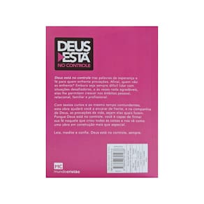 Sinopse Deus está no controle traz palavras de esperança e fé para quem enfrenta provações. Afinal, quem não as enfrenta? Embora seja sempre difícil lidar com situações desafiadoras, e às vezes nada agradáveis, elas lhe permitem crescer pessoal, relacional, familiar e profissionalmente. Com textos curtos e ao mesmo tempo contundentes, esta obra o ajudará a encarar de frente, e na companhia de Deus, as provações da vida, sejam elas quais forem. Porque Deus está no controle,você é capaz de firmar sua fé naquele que criou todas as coisas e o vê como uma obra em construção mais que especial. Leia, medite e confie. Deus está no controle, sempre.