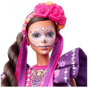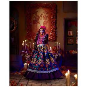 A Barbie celebra o Día De Muertos 2022 com uma boneca colecionável que homenageia as tradições, símbolos e rituais do feriado consagrado pelo tempo. A boneca Barbie usa um vestido de babados em um rico roxo real, com esqueletos de impressão de pigmentos, caveiras de açúcar calavera e detalhes de flores. Seu cabelo está puxado para trás para destacar a impressionante pintura facial de calavera. Uma flor vibrante de cempasúchil e uma faixa de cabeça rosa com fitas de streaming completam o lindo visual da boneca Barbie. Em uma linda embalagem com uma ilustração , esta boneca Barbie colecionável é ideal para exibição e presente Marca: Não Informado
