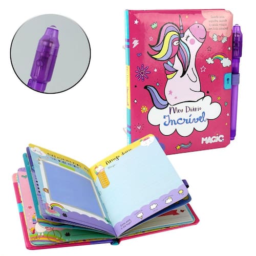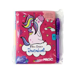 Diário Secreto 48 FL com Caneta Mágica P Un - Meu Diário Mágico possui uma caneta mágica de tinta invisível, que só revela o que foi escrito com sua luz especial na ponta;\n- Capa almofada, com cadeado e páginas decoradas;\nEspecificações:\nMarca : MAGIC KIDS\nTipo de material : Papel\nCores ou Estampa : Colorido\nDimensões do Produto : 15 X 12 X 1,5 CM\nDimensões da Embalagem : 16 X 13 X 1,5 CM\nPeso Bruto (Gramas) : 0.124 Marca: Não Informado