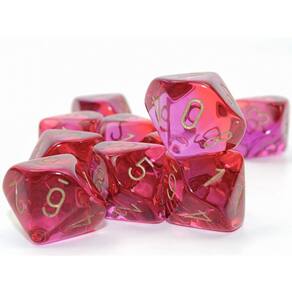 Dados Gemini translúcidos vermelhos e violetas com números dourados D10 Pacote de 10 dados Chessex de 16 mm (5/8 pol.) - Lindos dados Gemini D10 com cores translúcidas de vermelho-violeta e dourado. - Esses dados são perfeitos para RPGs de mesa, como Dungeons and Dragons, Shadowrun, Pathfinder, Savage World e Warhammer. Eles serão uma excelente edição para qualquer RPG ou jogo de tabuleiro que você queira jogar! - 10 dados D10, perfeitos para jogadas de alto dano e muito mais. - Inclui uma caixa de plástico para guardar seus dados - Porque você nunca pode ter muitos dados...