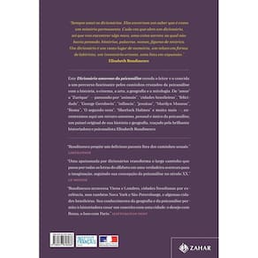 Um roteiro afetivo da história da psicanálise Nesse livro, Elisabeth Roudinesco abandona sua abordagem acadêmica habitual para dar livre curso a encadeamentos inéditos. Em vez de conceitos, atores ou países, o leitor encontra temas, palavras, ficções e territórios reunidos de modo arbitrário e pessoal, além de citações, remissões e um índice onomástico. Algo como uma aventura do imaginário urdida no correr da pena, um percurso sem destino, um roteiro afetivo com verbetes inesperados que podem ser lidos em sequência ou não. Cruzando cidades e museus, personagens, poemas e romances que lhe são familiares ou que aprecia em particular, Roudinesco adota o método intuitivo para esclarecer ao leitor como a psicanálise alimentou-se de literatura, cinema, teatro, viagens e mitologias para se tornar uma cultura universal. De “Amor” a “Zurique”, passando por “Animais”, “Cidades brasileiras”, “O Segundo Sexo”, “ Hollywood”, “David Cronenberg”, “Jesuítas”, “Sherlock Holmes”, “Marilyn Monroe”, “Paris”, “Felicidade”, “Psiquê”, “Leonardo da Vinci” e muito mais –, o livro reúne uma vastidão de experiências e palavras. “Sempre amei os dicionários. Eles encerram um saber que é como um mistério permanente. Cada vez que abro um dicionário, sei que vou encontrar algo novo, uma coisa secreta na qual não havia pensado, histórias, palavras, nomes, figuras de linguagem. Um dicionário é um vasto lugar de memória, um relato em forma de labirinto, um inventário errante, uma lista em expansão” da introdução, por Elisabeth Roudinesco.