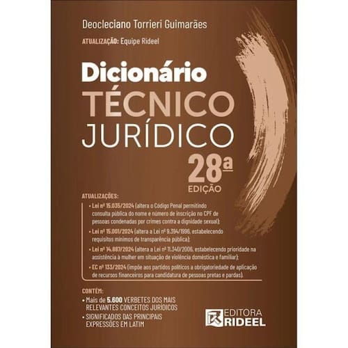 A Editora Rideel, empresa reconhecida por sua longa história e tradição na edição de livros de legislação, publica a 28ª edição desta obra atualizada com as últimas alterações trazidas pela nossa legislaçao. Gratos ao leitor, desde já, pela leitura desta obra, procuramos manter, na medida do possível, as explicações autênticos do Autor, atualizadas de acordo com as alterações legais, assim como a referência legislativa quanto aos diplomas normativos publicados após a última edição. As normas legislativas, jurisprudenciais e doutrinárias do País estão em constante transformação e pedem um acompanhamento contínuo, o que torna o trabalho bastante complexo e sempre aberto. Nesta edição foram feitas alterações trazidas pelos diplomas a seguir: Lei nº 15.035/2024 (altera o Código Penal permitindo consulta pública do nome e número de inscrição no CPF de pessoas condenadas por crimes contra a dignidade sexual); Lei n° 15.001/2024 (altera a Lei n° 9.394/1996, estabelecendo requisitos mínimos de transparência pública); Lei n° 14.887/2024 (altera a Lei nº 11.340/2006, estabelecendo prioridade na assistência à mulher em situação de violência doméstica e familiar); EC n° 133/2024 (impõe aos partidos políticos a obrigatoriedade de aplicação de recursos financeiros para candidatura de pessoas pretas e pardas), entre outras. A obra do mestre Torrieri permanece em evidência e merece ser preservada, não só na inteireza formal dos verbetes aqui contidos, mas, sim, no espírito de constante renovação da linguagem jurídica. Esperamos ter honrado este princípio. Marca: Não Informado
