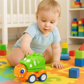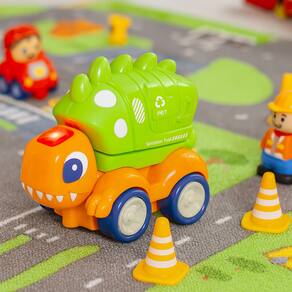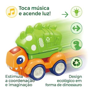 Ao apertar o botão, o carrinho sai em disparada com o container ecológico balançando de um lado para o outro, enquanto emite sons de dinossauro, músicas animadas e luzes piscantes. Uma verdadeira aventura que une ação e conscientização desde cedo!