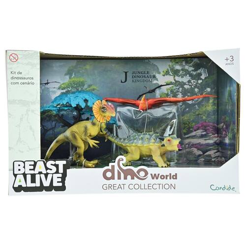 Kit composto por 3 dinossauros miniatura colecionáveis e 1 arvore para compor cenário.