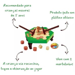 Não deixe o dinossauro cair pois você perderá o jogo! Primeiro, monte a plataforma de pedras, encaixe os pezinhos na plataforma, coloque o dinossauro na plataforma e gire a roleta para saber qual e quantas pedras você irá quebrar.*As cores do produto podem variar das apresentadas nas fotos.Especificações TécnicasMarca: DDGtoys Idade recomendada: A partir de 5 anosComposição / Material: Plástico Ação do Brinquedo depende de pilhas ou baterias: Não Brinquedo com Luz: NãoBrinquedo com Som: NãoBrinquedo com voz: NãoConteúdo da embalagem: 38 Peças “pedras”, 4 Pés , 1 Plataforma, 1 roleta, 2 Martelinhos, 1 DinoDimensões aproximadas da embalagem, Altura x Largura x Comprimento (Centímetros): 6 x 26 x 26Certificação do Produto: Registro 000892/2022 OCP0061Garantia do Fornecedor: 3 meses para defeito de fabricação. Referência do fabricante: 100-5Referência da Loja: 14753 Marca: DDGTOYS