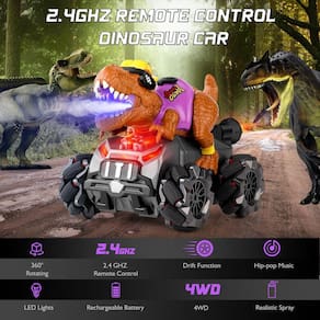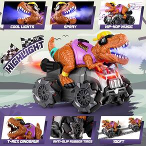 - 🚗 [Música, luzes e spray super legais] Este brinquedo de carro de dinossauro com controle remoto para meninos e meninas tem novos recursos aprimorados de música, spray de água e luz, com um emocionante spray de água e luz bucal de dinossauro, além de música dinâmica, então a diversão manterá entretidos os amantes de dinossauros e os amantes de carros RC amadores.