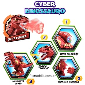 O Cyber Tiranossauro Rex é um hybrido Robótico com movimentos realistas, ele mexe a causa, anda, mexe as asas, acende uma luzes no corpo e na boca acende lluzes coloridas nas costas e na boca no momento em que vai soltar a fumaça, cria a magia e ilusão de estar cuspindo fogo, um arraso de brinquedo que encanta até adultos.