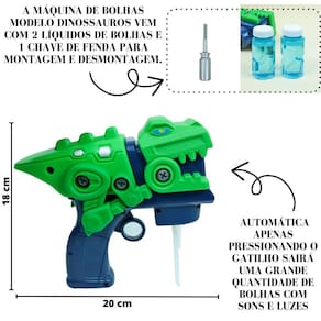 Informações Técnicas: Composição: Plástico. Altura: 18cm. Comprimento: 18cm. Largura: 9cm. 02 potinhos refil de solução de sabão. Peso: 239gramas. Pilhas: 03 AA não incluídas.