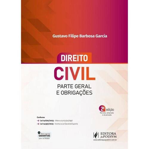 CONFORME: • Lei 14.620/2023 – Altera a Lei 9.514/1997 • Lei 14.597/2023 – Institui a Lei Geral do Esporte POR QUE ESCOLHER A OBRA “DIREITO CIVIL - PARTE GERAL E OBRIGAÇÕES”? Esta obra tem como objetivo a análise didática e atualizada da Parte Geral do Direito Civil e das Obrigações. Procura-se relacionar os institutos gerais do Direito Civil e do Direito das Obrigações com certos aspectos mais específicos, para a compreensão global e mais adequada da disciplina. Este livro foi escrito com o especial enfoque de proporcionar um estudo diferenciado e abrangente da referida disciplina, em conformidade com a evolução doutrinária, jurisprudencial e legislativa a respeito dos seus diversos temas. Espera-se, assim, que a presente obra possa receber a mesma acolhida das anteriores. Gustavo Filipe Barbosa Garcia Marca: JUSPODIVM **