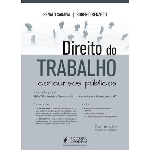 CONFORME: • Lei 14.846/2024 – Acrescenta dispositivo à CLT, para atribuir medida especial de proteção ao trabalho realizado em arquivos, em bibliotecas, em museus e em centros de documentação e memória. • Lei 14.824/2024 – Dispõe sobre a composição, o funcionamento e a competência do Conselho Superior da Justiça do Trabalho e altera a CLT. CONTÉM: • Resumos das matérias ao final dos capítulos. • Capítulo com Súmulas do TST. • + de 200 questões de concursos públicos. POR QUE ESCOLHER O LIVRO “DIREITO DO TRABALHO PARA CONCURSOS PÚBLICOS”? O presente livro tem por objetivo apresentar o Direito do Trabalho de forma abrangente, simples e clara, auxiliando a todos os estudantes na árdua tarefa que agora empreendem na realização de provas e concursos na seara trabalhista. A obra é indicada a todos aqueles que estão se preparando para a realização de provas objetivas que demandam um conteúdo programático que envolva Direito do Trabalho. Todos os capítulos foram elaborados com o escopo de permitir ao leitor um acompanhamento integral da matéria, auxiliando na interpretação da norma legal trabalhista, súmulas e orientações jurisprudenciais. Para que o leitor possa acompanhar o posicionamento das bancas examinadoras e testar seus conhecimentos, incluímos algumas questões de concursos recentes, buscando permitir um treinamento efetivo sobre o tema estudado, como forma de revisar a matéria e verificar a assimilação do conteúdo. Preocupamo-nos, em todos os institutos, com a utilização, sempre que possível, da jurisprudência, pois podemos afirmar que ela vem sendo adotada reiteradamente em provas e concursos em todos os níveis. Em temas controvertidos, a citação de outros doutrinadores não foi esquecida, trazendo ao leitor opiniões distintas de outros autores, para que o intérprete possa formar seu convencimento mediante a análise de vários posicionamentos. Enfim, o leitor encontrará uma obra completamente atualizada. Essa foi a preocupação constante ao longo das novas edições. Uma boa leitura a todos e bom estudo! Marca: Não Informado
