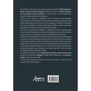 Este trabalho é continuação de um primeiro estudo denominado “Till Eulenspiegel: Do direito e do avesso de um herói pícaro”, publicado em 2013 em “Direito e Literatura: por que devemos escrever narrativas” a convite de um de seus organizadores, professor Bernardo Barbosa Gomes Nogueira. Professor Gomes Nogueira é advogado, mestre em Ciências Jurídico-Filosóficas (Universidade de Coimbra), doutor em Direito (Pontifícia Universidade Católica de Minas Gerais). Atualmente, leciona nos cursos de pós-graduação do Instituto de Educação Continuada da PUC/MG, é Mediador Credenciado pelo TJMG e membro honorário da Rede Brasileira de Direito e Literatura, entre outras atribuições. São quatro os pesquisadores, advogados e estudantes do Direito envolvidos neste primeiro trabalho coordenado por Junia de Castro Magalhães Alves, mestra em Inglês e doutora em Literatura Comparada pela Universidade Federal de Minas Gerais. Os teatrólogos selecionados para esta primeira investida são expoentes da dramaturgia e partiram da escolha pessoal dos envolvidos. Todos os textos permeiam o mundo da literatura gótica: tendência literária representante do Romantismo misterioso e obscuro, abastecida por sonhos, fantasias, loucuras, insanidades, fantasmas, enfim, pela morte. As narrativas controversas margeiam mais o metafísico do que o físico, trazendo à tona sentimentos antagônicos que questionam as condutas dos heróis e dos anti-heróis, levantando discussões filosóficas e jurídicas. São exploradas as peças de teatro: Os gigantes da montanha e Assim é se lhe parece, do italiano Luigi Pirandello; Macbeth, do inglês William Shakespeare; e As bruxas de Salem, do americano Arthur Miller. Os textos desta publicação confirmam o interesse de autores e leitores pela arte dramática e pela ciência jurídica.