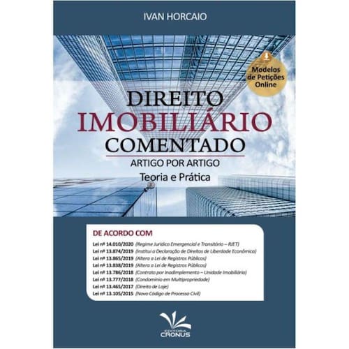 de ACORdo COM: Lei n 4.380/1964 (Sistema financeiro da habitação); Lei n 4.591/1964 (Dispõe sobre condomínio e incorporações); decreto-lei n 70/1966 (Execução extrajudicial de hipoteca de imóvel); Lei n 6.015/1973 (Lei dos Registros Públicos); Lei n 6.530/1978 (Lei dos Corretores de Imóveis); Lei n 6.766/1979 (Lei do Parcelamento do Solo Urbano); Lei n 8.245/1991 (Lei das Locações); Lei n 9.514/1997 (Sistema de Financiamento Imobiliário SFI); Lei n 10.406/2002 (Código Civil); Lei n 13.105/2015 (Novo Código de Processo Civil); Lei n 13.465/2017 (Lei da administração, aforamento e alienação de bens imóveis de domínio da União); Lei n 13.777/2018 (Condomínio em Multipropriedade); Lei n 13.786/2018 (Lei do inadimplemento em incorporação imobiliária e em parcelamento de solo urbano); Lei n 13.865/2019 (Altera a Lei de Registros Públicos); Lei n 13.838/2019 (Altera a Lei de Registros Públicos); Lei n 13.874/2019 (Institui a declaração de Direitos de Liberdade Econômica); Lei n 14.010/2020 (Dispõe sobre o Regime Jurídico Emergencial e Transitório das relações jurídicas de Direito Privado (RJET) no período da pandemia do coronavírus (Covid-19)). O Direito Imobiliário é um ramo do Direito Privado que possui regras jurídicas acerca da propriedade sobre os bens imóveis. Suas raízes estão, por isso, no direito de propriedade. Sua função é disciplinar os aspectos que dizem respeito ao aluguel, compra e venda, doação, usucapião, financiamento de casa própria, direito de vizinhança, posse, cessão de direitos, troca, aquisição e perda da propriedade, direito de construir, direito de preferência do inquilino, registro de imóveis e outras relações com o bem imóvel. Ao contrário do que o senso comum imagina os bens imóveis não são apenas casas, prédios e terrenos. Para compreender o Direito Imobiliário, é preciso entender esse conceito e tudo o que ele abrange. de acordo com o Código Civil, são bens imóveis o solo e tudo quanto se l Ean: 9788561544737