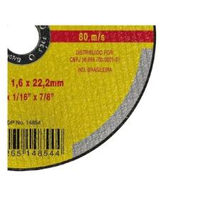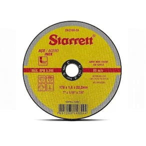 - Marca: Starrett; - Modelo: DAC180-24; - Diâmetro externo: 7" (178mm); - Espessura: 1,6mm; - Diâmetro do furo: 7/8" (22,22mm); - Rotações por minuto: 8.595rpm; - Rotação (metros por segundo): 80 m/s; - Aplicação: Materiais em aço carbono e Inox (tubos, chapas, perfis, barras, entre outros materiais ferrosos); - Máquinas compatíveis: Esmerilhadeiras manuais de 7"; - Centro: Plano.