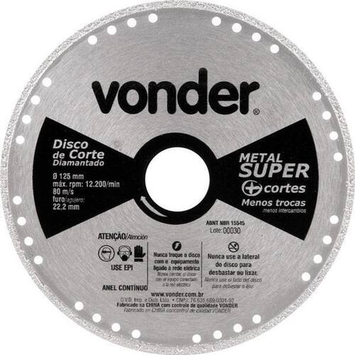 Marca:vonderconteúdo da embalagem:1 disco de corte diamantadodescrição:disco de corte diamantado, contínuo, para metais, metal super, 125 mm, vonderindicações:indicado para serralheiros e demais profissionais em geral. Ideal para cortar barras, tubos, chapas metálicas, aço carbono e aço inox. Utilizado em esmerilhadeiras.Características técnicas:categoria do multímetro: cat iii 600v diâmetro do furo do disco de corte diamantado: 22,2 mm tipo de corte do disco de corte diamantado: a seco perfil do corte: anel contínuo rotação máxima rpm : 12200 /mincodigo do forncedor:1240000125 Marca: Não Informado