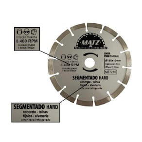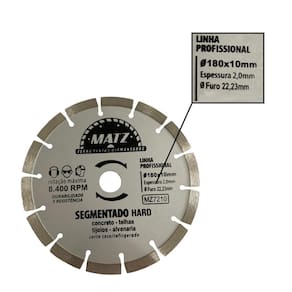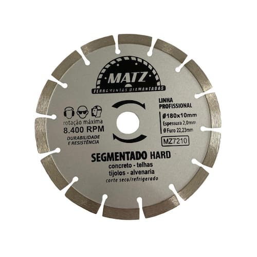 Disco de corte diamantado segmentado, ideal para cortes secos ou refrigerados em concretos, telhas, tijolos e alvenaria. Seus segmentos diamantados garantem alta durabilidade, cortes rápidos e remoção eficiente de material, proporcionando acabamento limpo e preciso. Resistente ao desgaste, é perfeito para uso em obras e reformas, oferecendo desempenho em materiais de construção. Informações técnicas: Perfil do corte: Segmentado Diamantado Tipo de corte: A seco e refrigerado Dimensões: - Diâmetro externo: 180mm 7.1/4'' - Diâmetro do furo: 22,23mm 7/8'' - Acompanha anel de redução para 20mm - Perfil de corte: 10mm - Espessura: 2mm Rotação máxima por minuto RPM : 8.400 - 80m/s Para corte de: Concreto, telha, tijolo e alvenaria Proporciona qualidade e produtividade na operação Produto de altíssima qualidade com alta performance Marca: Não Informado Ean: 7896595584598