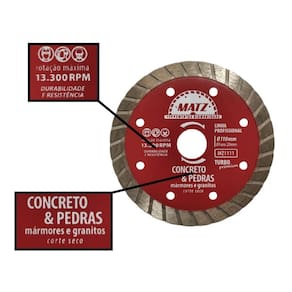 Disco Corte Diamantado Turbo Para Concreto Pedra 110X20Mm Matz Disco de corte turbo para pedras, concretos, mármores e granitos, ideal para cortes secos. Com design turbo, oferece alta velocidade e precisão, garantindo cortes limpos e sem lascas em materiais duros e abrasivos. Durável e resistente ao desgaste, é perfeito para aplicações que exigem desempenho profissional e acabamento de qualidade. Ideal para construção civil e projetos de reforma.