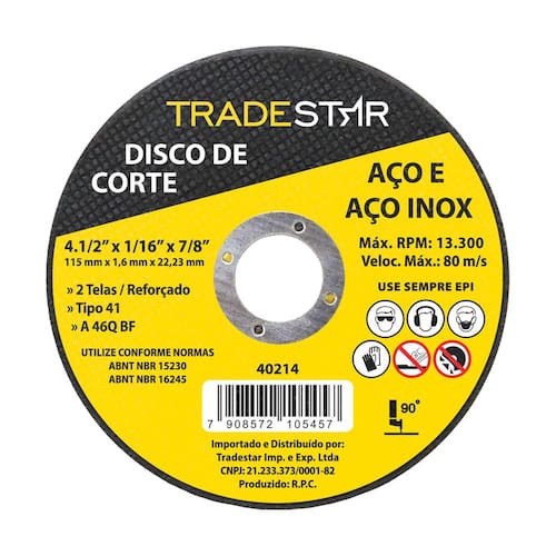 Tamanho: 4.1/2" (115 Mm) Espessura: 1,6 Mm Furo: 22,23 Mm R.P.M.: 13.300