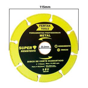 Disco de Corte Para Metal Diamantado Segmentado 115x22mm Fertak O Disco de Corte Para Metal Diamantado Segmentado 115x22mm é ideal para cortes precisos e duráveis em diversos metais. Com tecnologia diamantada, oferece eficiência, resistência e cortes rápidos, reduzindo o desgaste da peça.