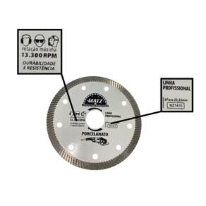 Informações técnicas: Perfil do corte: Turbo Diamantado Tipo de corte: A seco e refrigerado Dimensões: - Diâmetro externo: 110mm 4.3/8'' - Diâmetro do furo: 22,23mm 7/8'' - Acompanha anel de redução para 20mm - Perfil de corte: 8mm - Espessura: 1mm Rotação máxima por minuto RPM : 13.300 - 80m/s Para corte de: Porcelanato Proporciona qualidade e produtividade na operação Produto de altíssima qualidade com alta performance