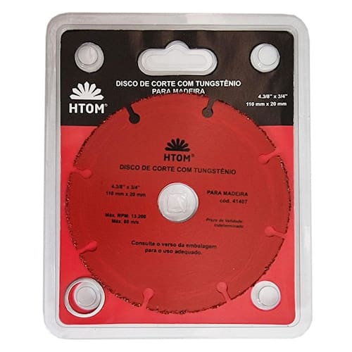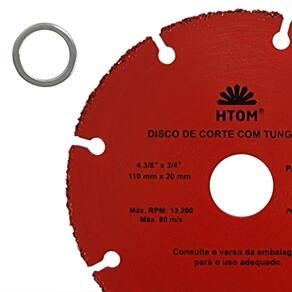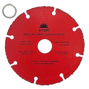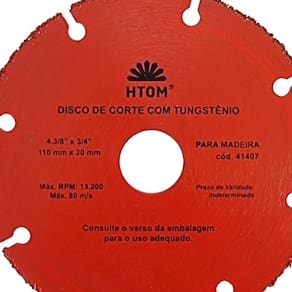 Disco de Corte 110mm Tungstênio para Madeira Uso em Serra Mármore HTOM Único modelo de disco de corte seguro para cortar madeira com serra mármore Makita . Para cortar madeira dura, macia, placas de compensado, aglomerado, materiais de fibra como MDF, MDP e piso laminado, - Marca: HTOM - Referência: HTOM-41407 - Diâmetro: 110mm 4 1/2 - Furo: 20mm - Acompanha anel para 16mm - Disco de Tungstênio para corte em madeira - Para cortar madeira dura, macia, placas de compensado, aglomerado, materiais de fibra como MDF, MDP e piso laminado. - Único modelo de disco de corte seguro para cortar madeira com serra mármore Makita - Uso em serras mármores de qualquer marca: Makita, Bosch, Dewalt, etc. - Mais Durabilidade e melhor acabamento Disco de tungstênio para corte de madeira - Rotação máxima 13.200 rpm 80 m/x - Não deforma nem trava no material, permitindo excelente refrigeração, segurança e durabilidade - Peso bruto: 90 gramas - : 90 dias Marca: Não Informado Ean: 7898452027705