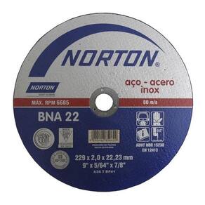 Disco de Corte 229x2x22,23 mm BNA22 Norton Características da Ferramenta: Os discos de corte Azul da linha BNA são indicados para cortes de aço carbono, E aços inoxidáveis nos processos de manutenção industrial Para Esmerilhadeira Imagem Meramente Ilustrativa Dados Técnicos: Reforço: 2 telas Diâmetro: 229mm Espessura:2,0mm Diâmetro do furo: 22,23mm Acompanha: 1un. Disco de Corte 229x2x22,23 mm BNA22 Norton : 90 dias fornecido pelo fabricante contra defeitos de fabricação Especificações: Código: 122191 Modelo: 66253371369 BNA22 Código EAN: Marca: Não Informado