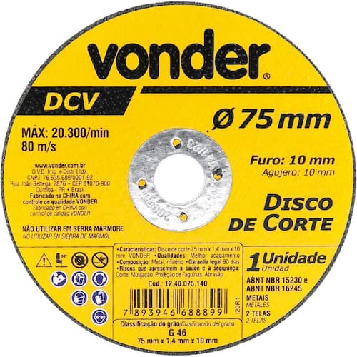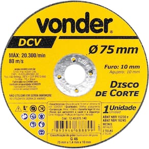 Marca: VonderConteúdo da Embalagem:1 Disco de corteDestaques e diferenciais:Proporciona cortes rápidos e menor geração de calor e rebarbasAplicações e dicas de uso:Indicado para corte de metais, inclusive aço inox. Utilizado em cortadores pneumáticos. Não utilizar em serra mármore.Características Técnicas:Diâmetro do disco de corte: 75 mm Espessura do disco de corte: 1,4 mm - +/- 1/16 Diâmetro do furo do disco de corte: 10 mm Marca: Não Informado Ean: 7893946688899