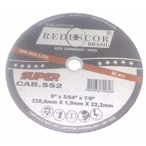 Disco de Corte Aço/Inox Super CAB.SS2228,6mm x 1.9mm x 22.2mm - 80m/sCARACTERISTICAS Utilizado juntamente com esmerilhadeiras nos trabalhos de corte em aços e metais ferrosos em geral. Proporciona um excelente rendimento nas operações de corte, devido a sua espessura mais fina que os discos de corte normais. Corpo reforçado com malha de fibra de vidro. Anel interno de aço especial.